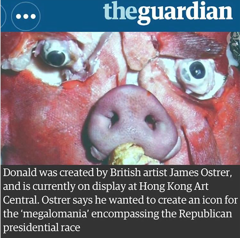 “I am responding to the vast divide between what we are being sold and what we are actually getting. Trump is a self-proclaimed success story of delusion. This right-wing Middle American madness spearheads the complete lack of care for the rest of the world and its population. Donald Trump professes to be a hugely successful businessman capable of leading America into economic success, yet in reality he is a maniacal narcissistic billionaire that inherited his wealth and lost more than he has gained through failed business choices. At the same time he is using his current media platform to drive further racial divide in humanity.”